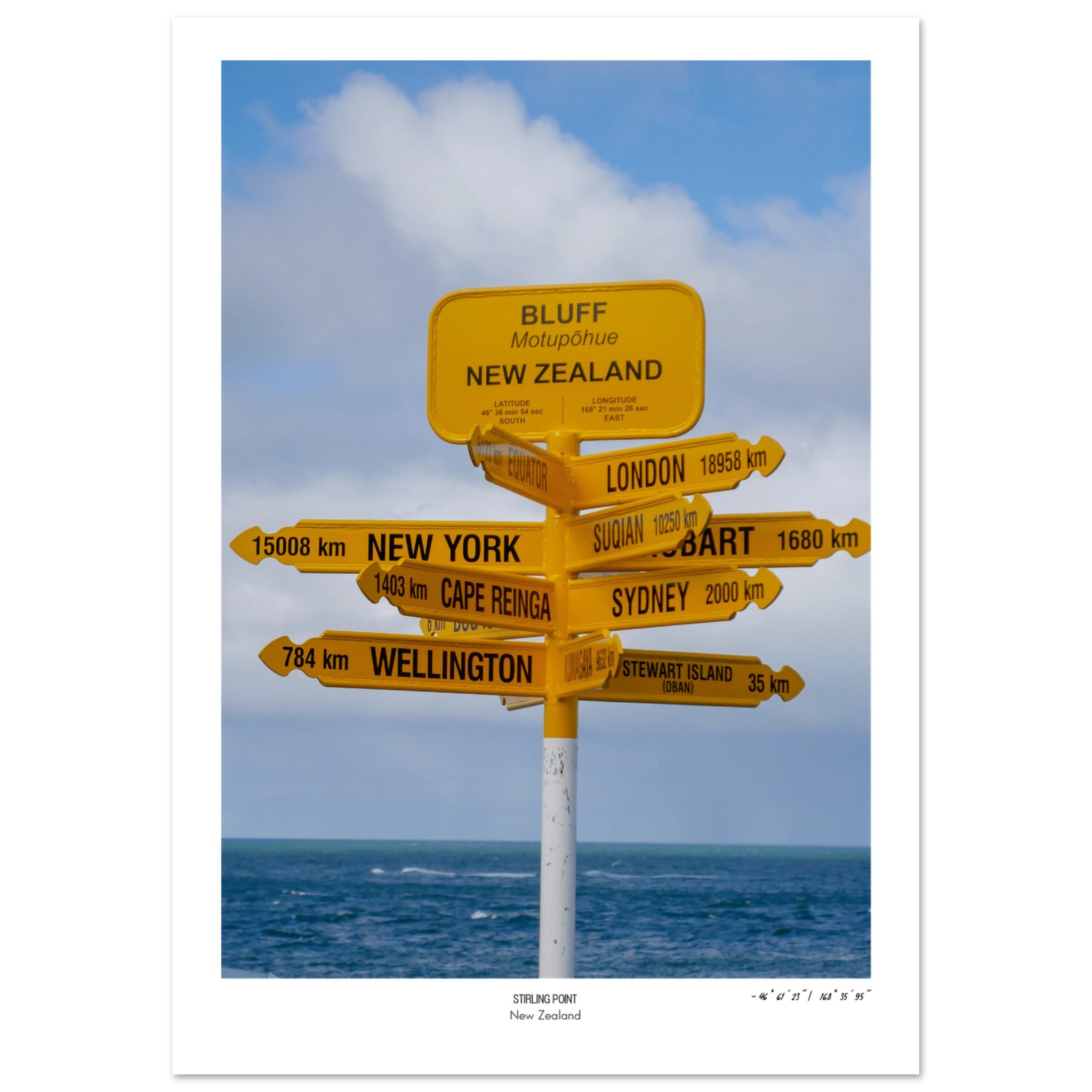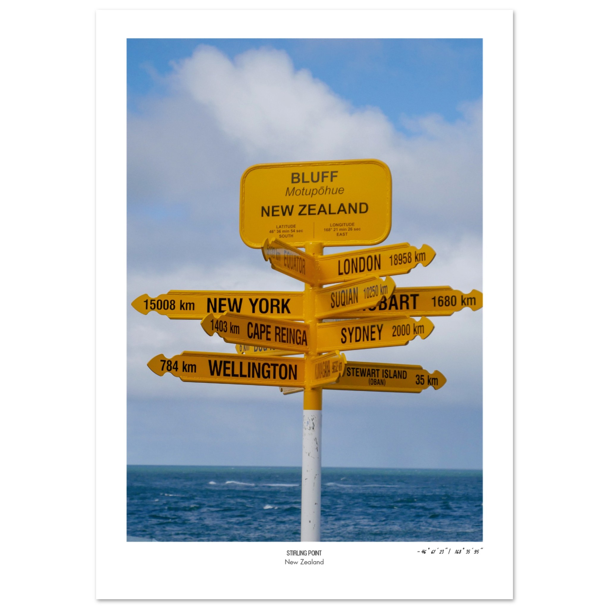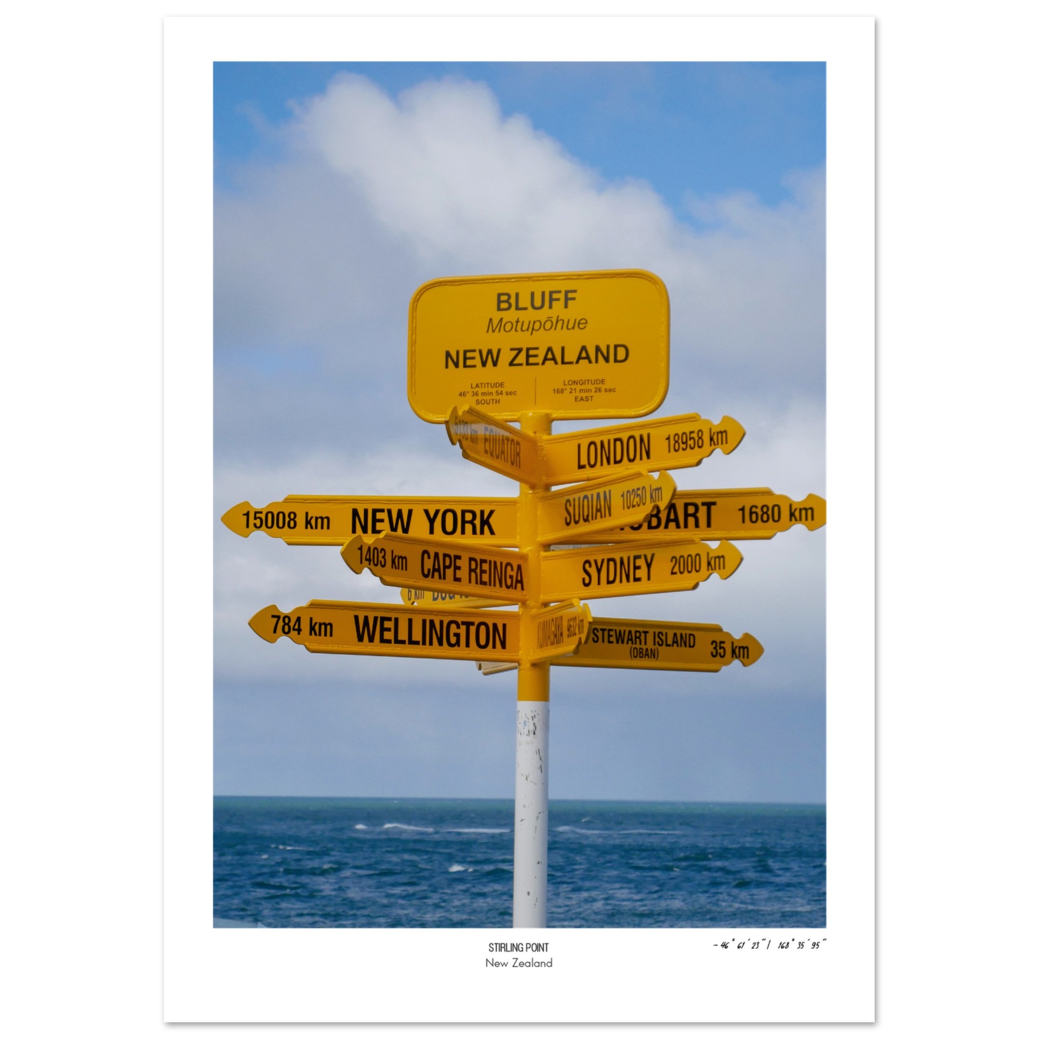 Stirling Point, Bluff near Invercargill is the end of the road on Zealand’s South Island. The last stop before Rakiura Stewart Island, The AA road sign for Motupohue is a welcome trails end for walkers of the Te Araroa.